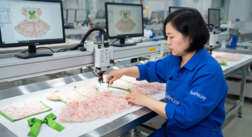 This is our advanced computerized cutting system that precisely shapes fabric pieces according to exact size patterns, guaranteeing consistency and fit accuracy for wholesale batches of pet dog dresses.