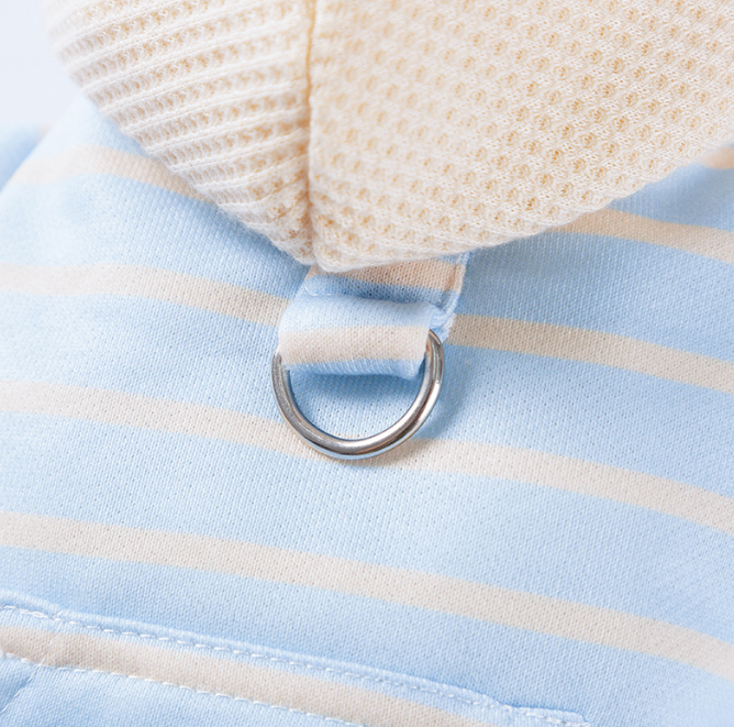 This is our adorable bunny-pocket dog outfit, featuring a soft purple body, striped top design, suspender-style shoulder details, and a lovely front pocket with bunny and fruit decoration for an extra charming look. We can customize the colors, patch design, pocket style, button details, fabric, D-ring position, and sizing to match your brand and market needs.