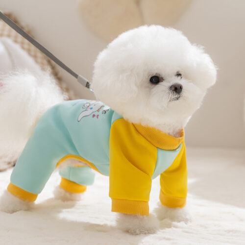 This is our cute pastel dog jumpsuit, designed with a fresh light blue body, bright yellow sleeves and collar, and a playful cartoon print that gives it a sweet and lively everyday look. We can customize the color combination, printed pattern, fabric, ribbed trim, size range, and branding details to create your own exclusive pet apparel style.