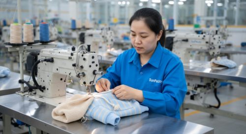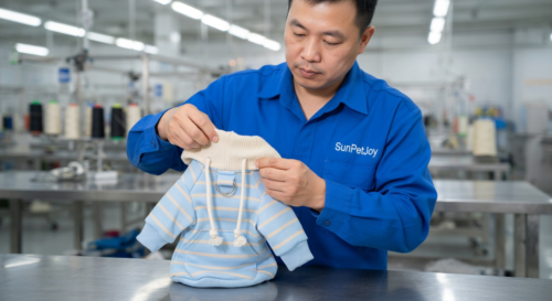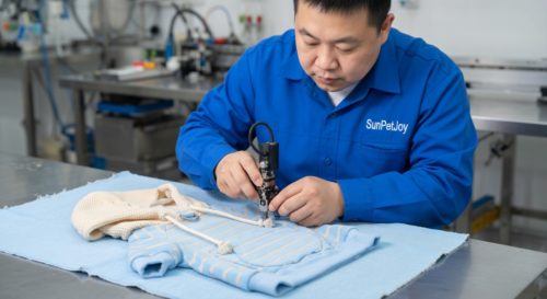 This is our sewing assembly stage where our operator creates strong seams on knit fabric for the small-sized dog garment, delivering precision and durable construction for dependable wholesale supply.