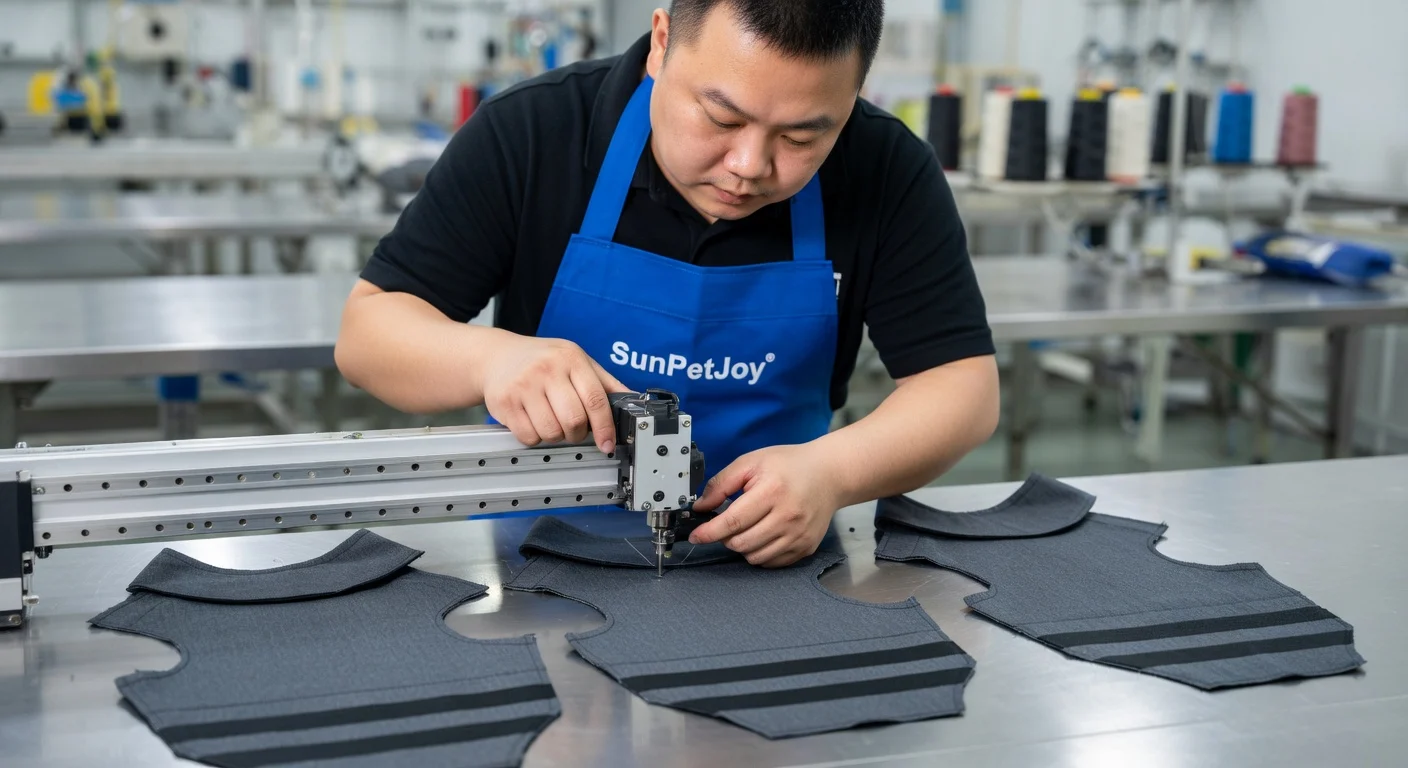 This is our precision cutting process where skilled technicians guide specialized equipment to accurately slice cotton nylon patterns for our dog anxiety jackets, ensuring size consistency and quality control for reliable wholesale supply.