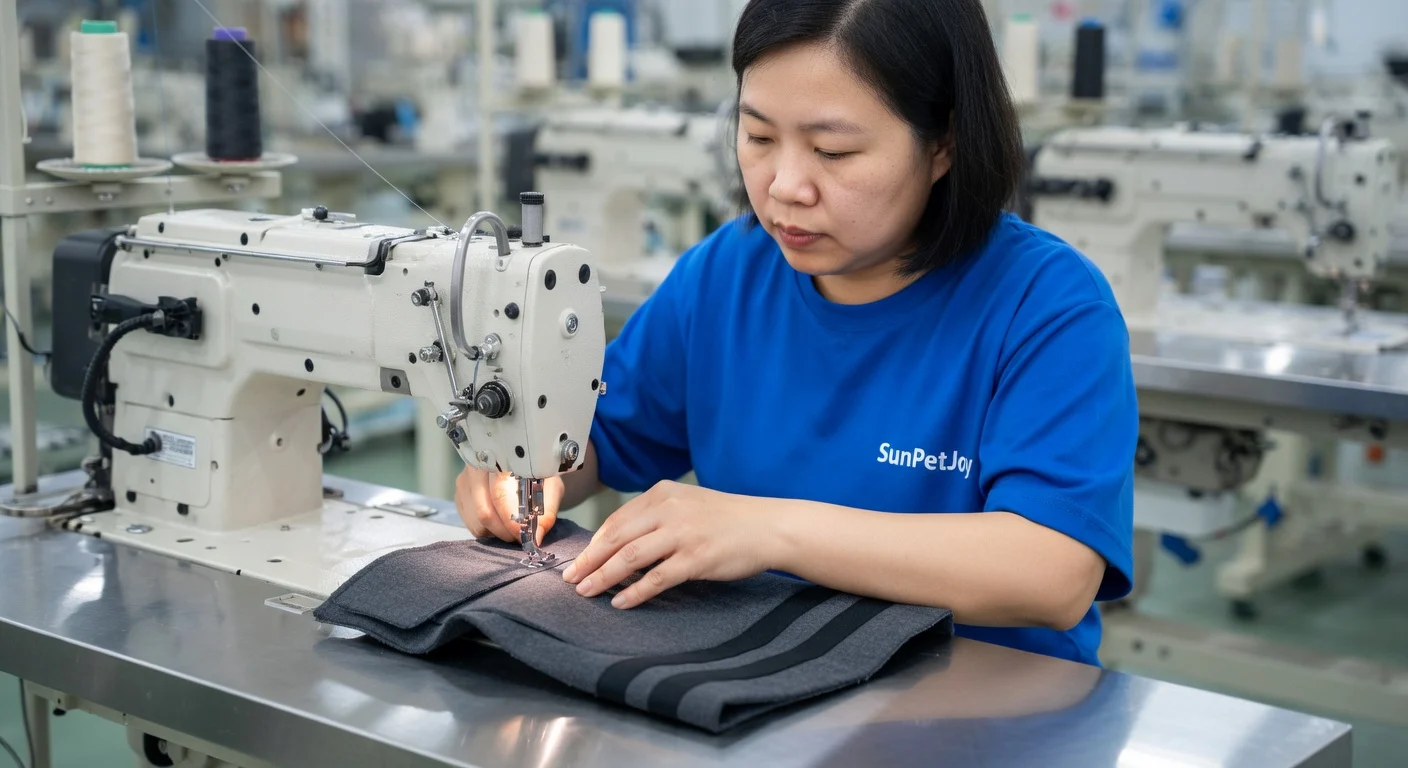 This is our industrial sewing stage where experienced operators join main body panels with strong seams on our dog anxiety jackets, delivering exceptional precision and durability for consistent wholesale production.