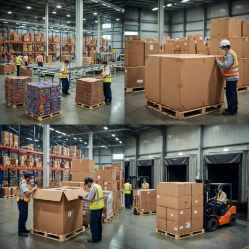 This is our logistics crew in the warehouse organizing large stacks of finished dog bandanas into bulk shipping boxes, sealing them securely with tape, and loading the pallets onto forklifts or trucks for transportation. They’re preparing everything for efficient wholesale distribution, emphasizing our focus on bulk handling to support global deliveries.