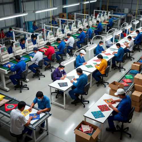 This is our workers handling the customization stage with embroidery machines to add logos or personalized details to the bandanas, then moving to quality inspection under bright lights to check seams and prints for any issues, and finally folding them for initial packaging. It shows the attention to detail that ensures each piece meets our standards before shipment.