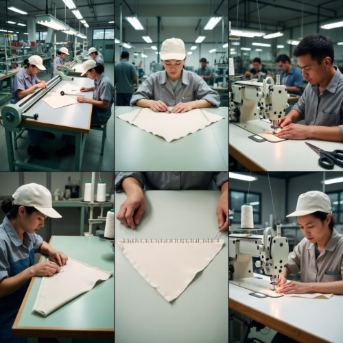 - Cutting: Fabric is precisely cut to triangular dimensions with rotary cutters or industrial cutting machines, promoting material efficiency and uniform sizing for scalable production.