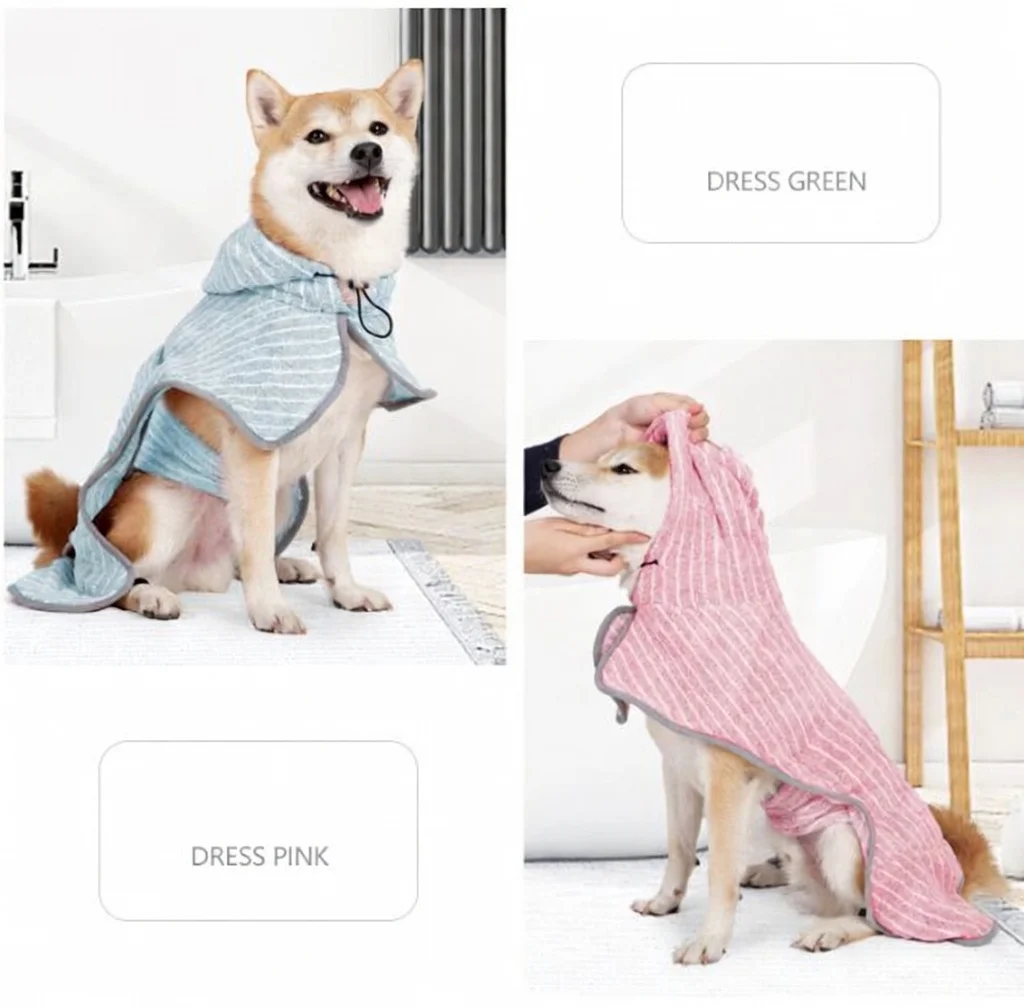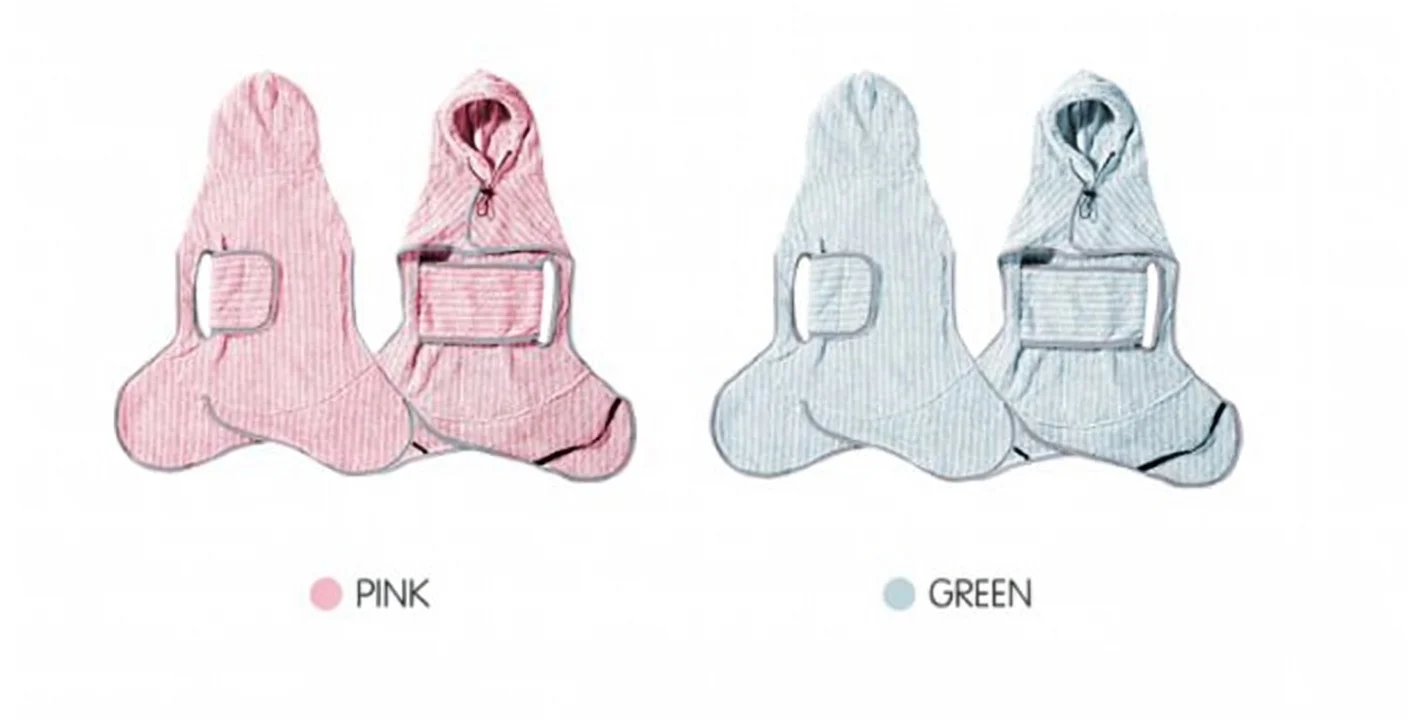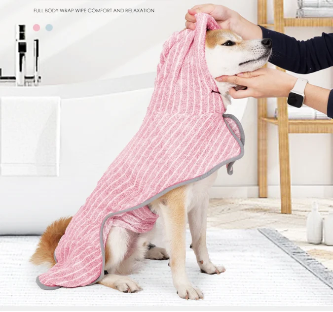 The Dog bathrobe towel is a functional garment designed for full-body coverage on dogs, utilizing striped towel fabric along with a hood, adjustable drawstring, and leg openings to support quick moisture absorption and a secure fit. It addresses needs in postoperative recovery and after-bathing routines. This product suits pet stores, online retailers, brand manufacturers, and wholesale buyers looking to stock reliable dog bathing products that align with consistent demand for bathrobe for dog solutions.