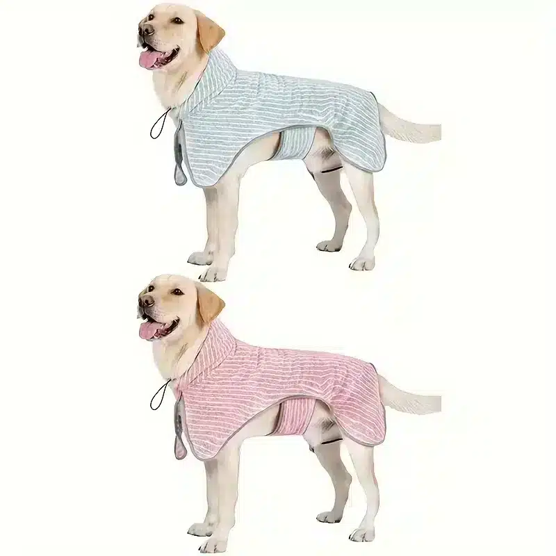 - E-commerce sellers feature the bathrobe for dogs in dedicated grooming or postoperative care collections, using detailed images that highlight the striped fabric, drawstring adjustment, and size options. The listing format helps online buyers quickly match the product to their dog’s measurements, improving conversion rates and reducing size-related returns while expanding the retailer’s average order value through complementary item suggestions.