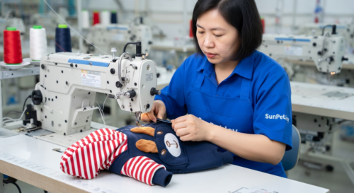 This is our expert sewing stage operating specialized machines to assemble seams on pet dog sweaters using knit fabric equipment. This delivers durable construction and consistent quality for bulk wholesale supply.