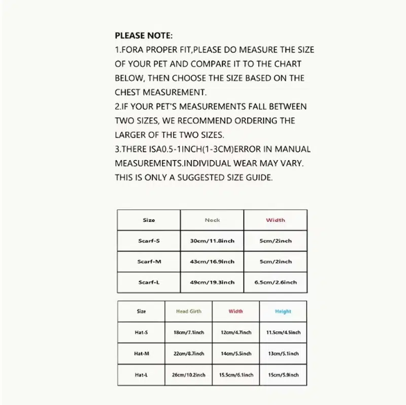 Please measure your pet and choose size based on head girth (hat) and max neck circumference (scarf). If between two sizes, we suggest choosing the larger size. Manual measurement tolerance: 1–3 cm.
