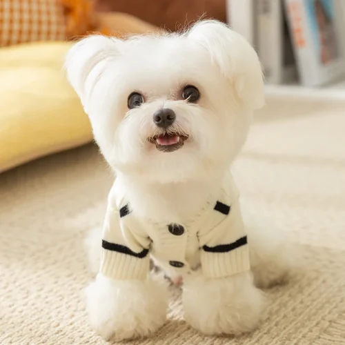 This is our custom dog knit cardigan style in a clean white base with classic black stripe accents, designed to give dogs a simple, elegant, and cozy everyday look. We can customize the color matching, knit pattern, button details, sizing, fabric quality, and brand label, so this style works well for different pet clothing collections and custom wholesale programs.