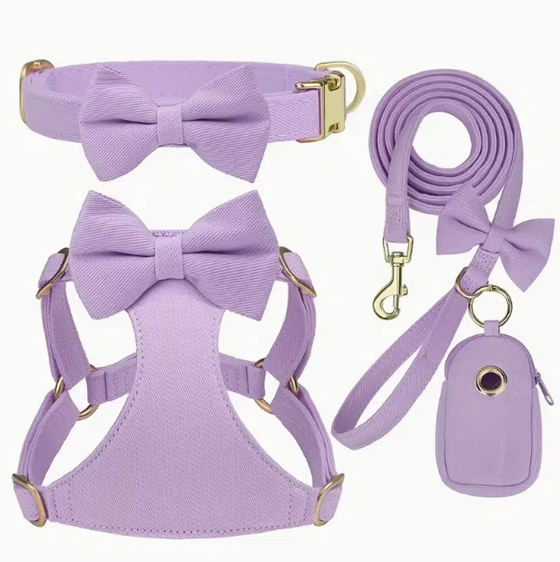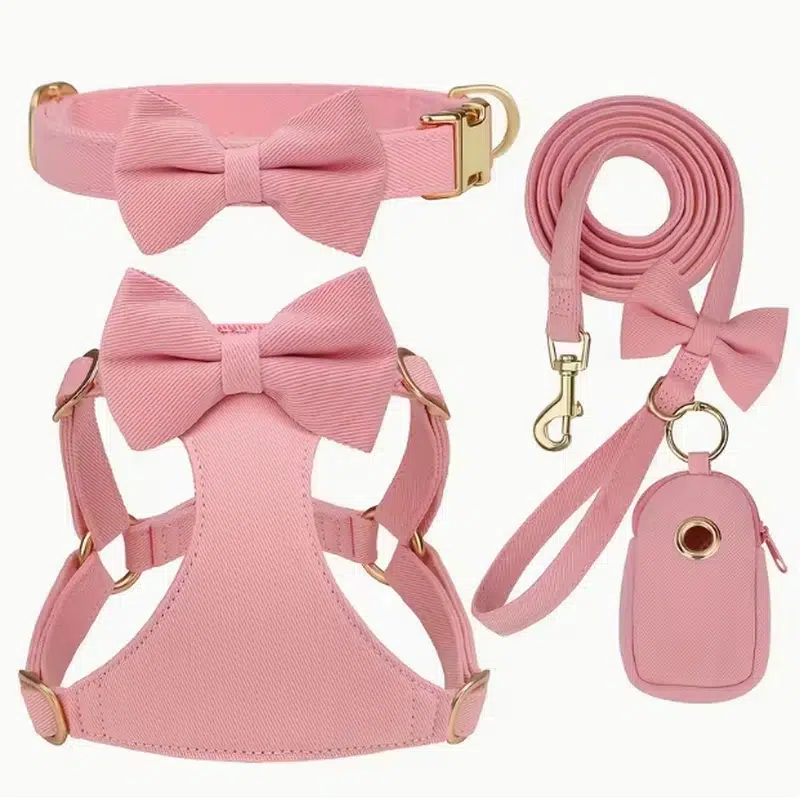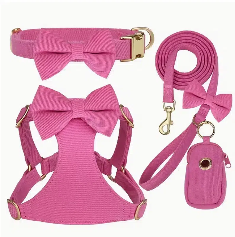 | Collar | Adjustable neck range; matching bow tie; metal buckle & ring | Pairs with harness for “matching set” positioning |