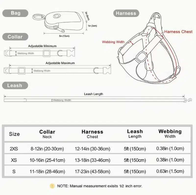 | Size | Collar Neck | Harness Chest | Leash Length | Webbing Width |
