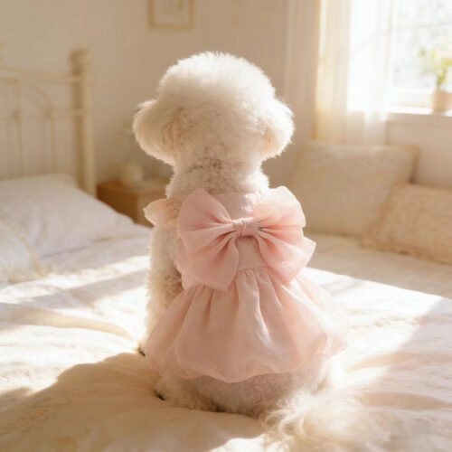 This is our soft pink bow dog dress, designed with a dreamy blush-pink color, a lightweight sheer skirt, delicate shoulder details, and an oversized back bow that gives it a sweet, elegant, and princess-inspired look. We can customize the fabric, color tone, bow size, dress length, size range, and branding details to create a style that fits your market and brand image perfectly.