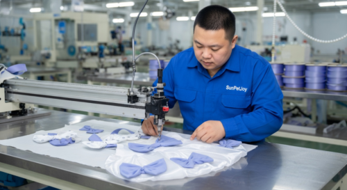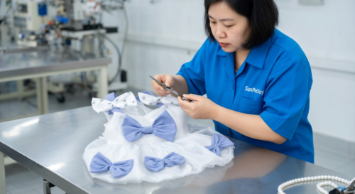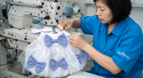 This is our dedicated bow attachment station where precise stitching forms and secures blue bows to each garment, upholding strict quality control for consistent wholesale pet dress reliability.