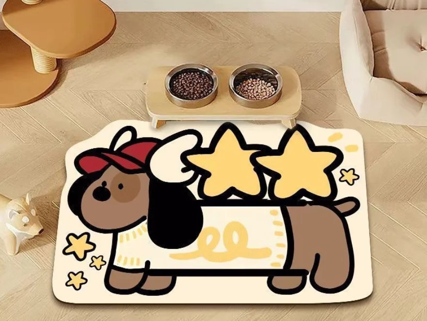 The dog eating mat is a cartoon-themed feeding pad with a polyester surface and diatom mud rubber base, available in sizes S (30×40cm), M (40×60cm), L (50×80cm), XL (60×90cm), and XXL (80×120cm). It is designed to contain spills during pet meals, protect floors, and support bulk wholesale procurement.