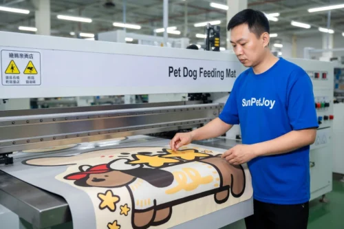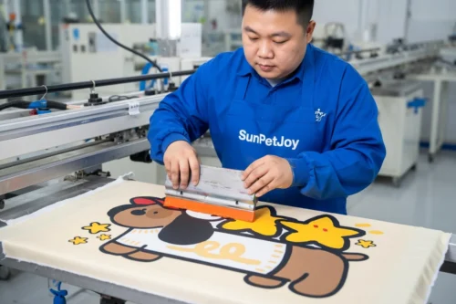 This is our precision screen printing station where technicians apply vibrant cartoon patterns to polyester fabric with exact color matching for dog feeding mats. Rigorous quality control ensures consistency and reliability for wholesale orders.