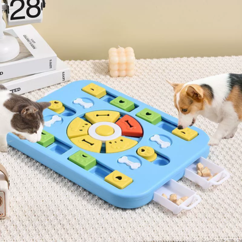 This is our multifunction interactive pet puzzle board, a larger slow feeder and treat-dispensing toy made for both dogs and cats. It combines sliding blocks, spinning parts, and pull-out drawers, giving pets multiple ways to explore food rewards and stay mentally stimulated during mealtime. This style is great for enrichment training and anti-boredom use, and we can customize the color combination, structure details, packaging, and private label branding based on your requirements.