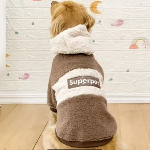 This is our warm teddy fleece dog hoodie, made with a soft plush texture, a cozy contrast-color hood, and a simple back label design that gives it a clean and comfortable winter look. We can customize the fleece color, patch label, hood shape, fabric thickness, size range, and brand details to fit your pet clothing collection.