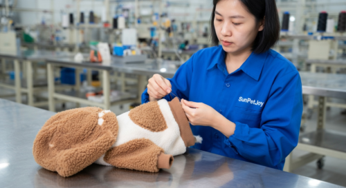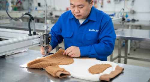 This is our precise assembly stage where contrast plush patches and ribbed cuffs are carefully attached to the small-sized dog fleece hoodie. Our quality control measures guarantee reliability and uniformity for wholesale customers.