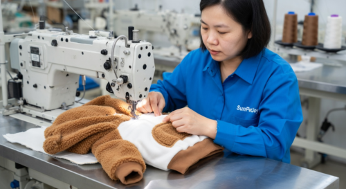 Components are then assembled using industrial sewing machines. Seams are constructed with attention to the shedding characteristics of sherpa fleece by applying finishing techniques such as overlock stitching. The hooded bear-ear section, contrast plush patches, and ribbed cuffs are attached with reinforced stitching to support structural integrity at stress points. Final assembly includes inspection of each unit for seam quality and overall appearance to maintain batch consistency.