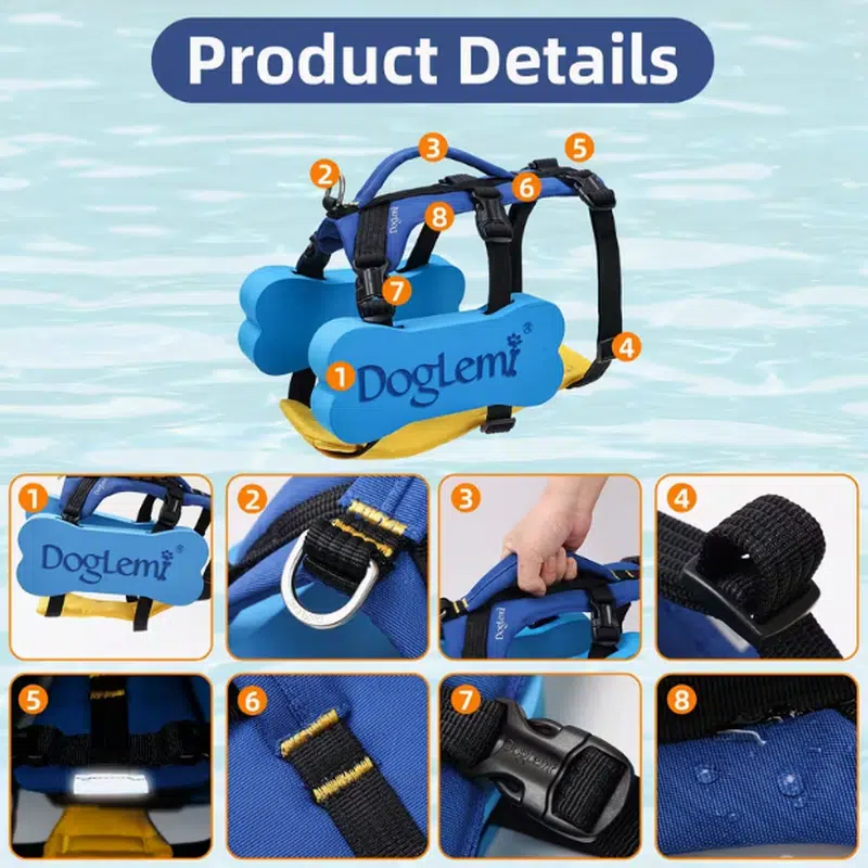 - Shoulder mobility: Designed to keep the shoulder area free for natural front-leg paddling; incorrect sizing is the main cause of restriction in any dog flotation vest product.