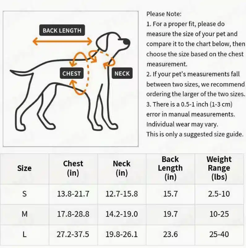 | Size | Chest | Neck | Back Length | Weight Range |
