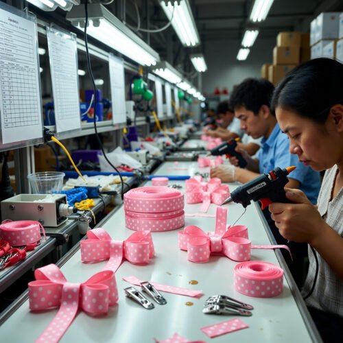 - Assembly attaches the bow to metal or plastic clips using adhesive like hot glue or stitching, ensuring a secure bond that withstands handling and enhances product reliability to lower return rates.