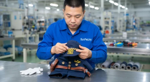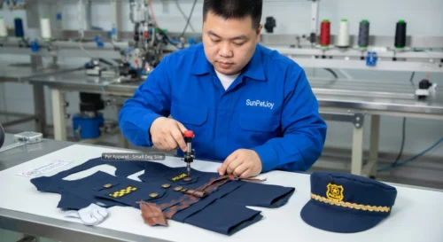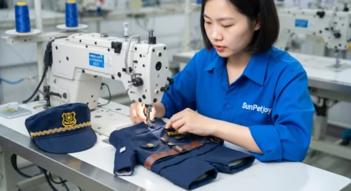 This is our detailed quality inspection and final assembly where we verify the hat component on the dog turtleneck police uniform maintaining strict standards precision and consistency across every wholesale batch.