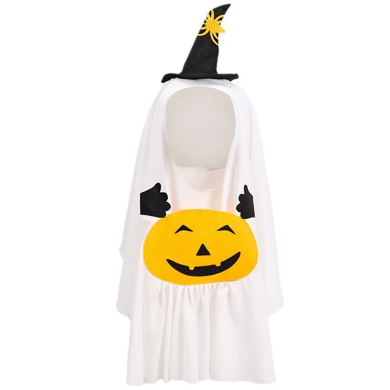 The dog halloween costumes pumpkin is a pet apparel product consisting of a white ghost cape with pumpkin face and thumbs-up accents together with a black witch hat featuring spider detail. Manufactured from viscose fiber, it is offered in three sizes with defined neck girth and length specifications to accommodate cats and multiple dog breeds. This item addresses requirements of individual merchants, pet stores, e-commerce sellers, brand owners, and wholesale buyers seeking seasonal inventory that supports efficient stock turnover, brand differentiation through distinctive design elements, and reliable supply for retail channels.