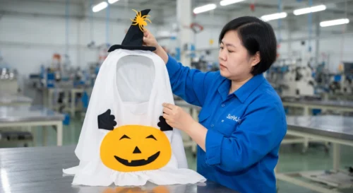 This is our final quality inspection and assembly where inspectors combine the ghost cape with the hat verifying every detail to guarantee superior standards and reliable wholesale delivery.