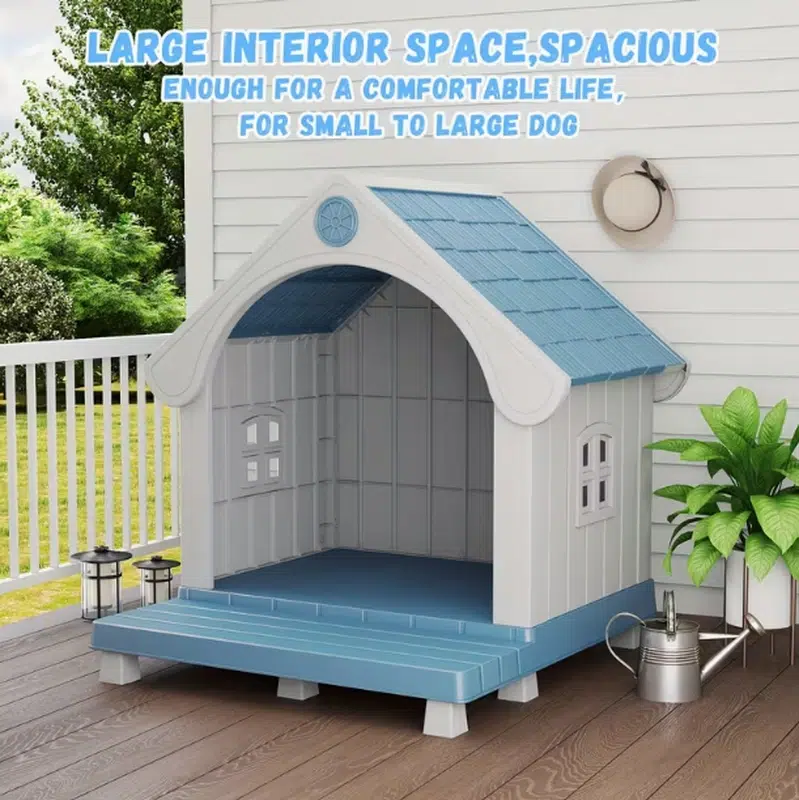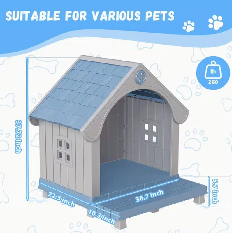 This is our plastic outdoor dog house, designed with a sturdy structure, ventilation openings, and a metal door for added safety. It provides pets with a protected resting space while maintaining good airflow, and we can customize this type of dog house for you in different colors, sizes, door styles, and structural designs.