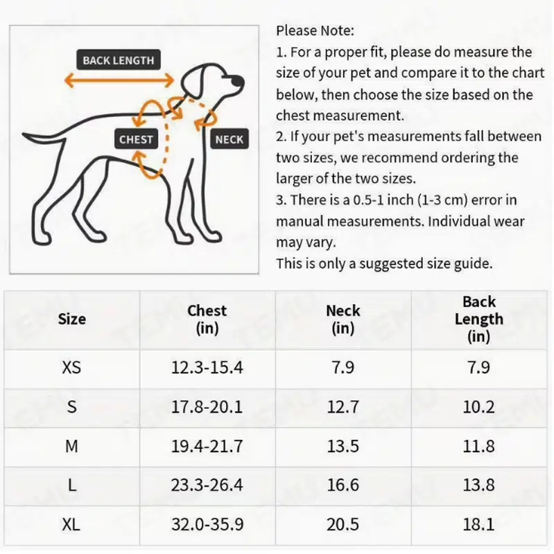 | Size | Chest (inches) | Neck (inches) | Back Length (inches) |