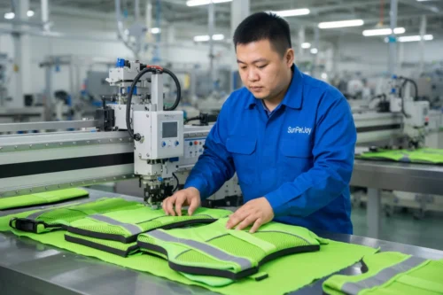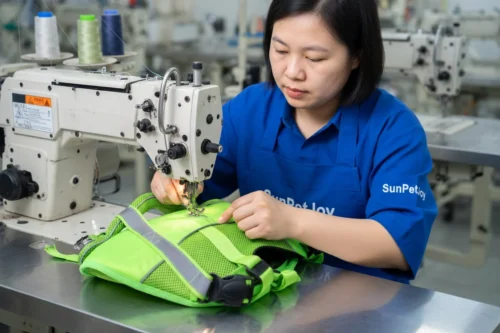 Assembly utilizes industrial sewing machines supporting lockstitch, chainstitch, and overedge techniques to join mesh panels, attach reflective strips, and reinforce high-stress areas. The reinforced rescue handle receives multiple rows of stitching for load distribution, while multi-point buckles are secured through specialized attachment stations. These steps ensure seam consistency and component alignment across every unit. Intermediate quality checks at cutting, sewing, and assembly stages verify measurements, stitch integrity, and reflective placement to maintain batch uniformity.