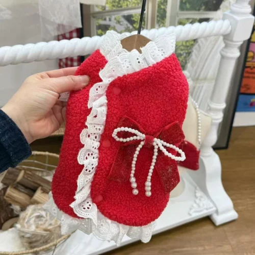 This is our cozy red sherpa Christmas dog onesie. Made from ultra-soft fluffy red fleece fabric, it’s beautifully adorned with delicate white lace ruffles along the collar and hem, plus a large sparkling red bow with dangling pearl accents on the chest for extra holiday charm. It’s warm, stylish, and ideal for keeping your furry friend comfy during the festive season. And the best part is we can customize this style with different colors, patterns, or special details to match exactly what you envision.