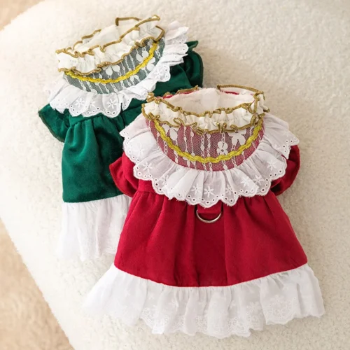 This is our festive velvet Christmas dog dress, available in vibrant red and rich emerald green. Crafted from soft velvet fabric, it features a dramatic multi-layered white lace ruffled collar with delicate gold trim, a pretty white lace hem, and a convenient metal ring on the back for leash attachment. These elegant designs are perfect for holiday photos and special celebrations. And the best part is we can customize this style with different colors, fabrics, or special details to suit your preferences exactly.