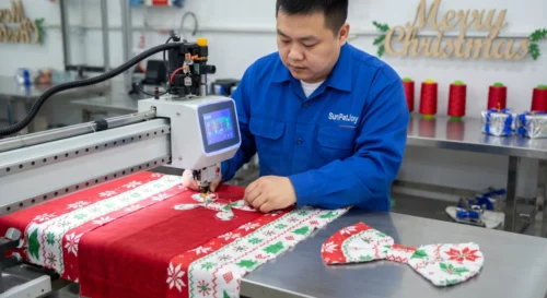 This is our automated cutting system creating precise pattern pieces from festive polyester fabric, ensuring exact dimensional consistency and quality control for reliable wholesale production of Christmas dog onesies.