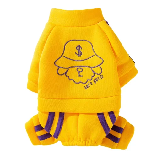 This is our vibrant yellow embroidered dog onesie. Crafted in bright yellow with a high collar and sporty design, it features a cool purple embroidery on the back showing a bucket hat with a dollar sign, a cute bear graphic, and the playful text “Let’s get it”. The lower part has stylish purple stripes on the legs for a trendy streetwear look, with full coverage including feet. And the best part is we can customize this style with different colors, patterns, or special details to suit your preferences exactly.