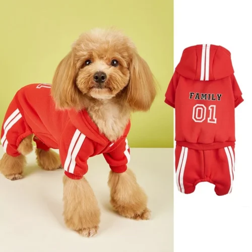 This is our sporty red hooded dog tracksuit onesie. This bright red jumpsuit comes with a hood featuring white stripes, matching white racing stripes on the sleeves and legs, and bold “FAMILY 01” lettering on the back. It gives your dog a cool athletic and family-team vibe with comfortable full-body coverage. And the best part is we can customize this style with different colors, patterns, or special details to match exactly what you envision.