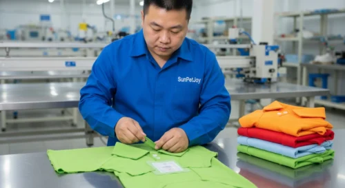 This is our rigorous quality inspection where our specialists check seam strength and overall finish on completed dog garments, upholding the highest standards for consistent and reliable wholesale delivery.