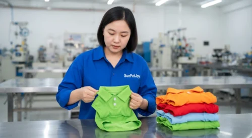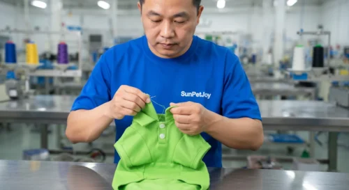This is our professional sewing process utilizing industrial machines to create durable seams on pet dog polo shirts, guaranteeing precision and strength that delivers consistent performance for bulk wholesale orders.