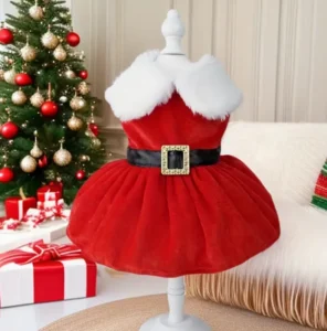 Boost your US pet store profits this holiday season with SUN PET’s premium dog Santa dress. Factory-direct pricing means higher margins for wholesalers and retailers. This plush red bestseller features golden ruffled hem, jeweled belt buckle, cozy faux fur collar, and snap-front closure—ready for Christmas photoshoots and parties.