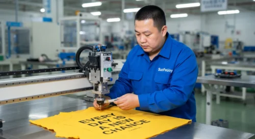 This is our precision cutting station where skilled technicians operate industrial equipment to create exact patterns for dog turtleneck sweaters, ensuring accuracy and consistency for reliable wholesale supply.
