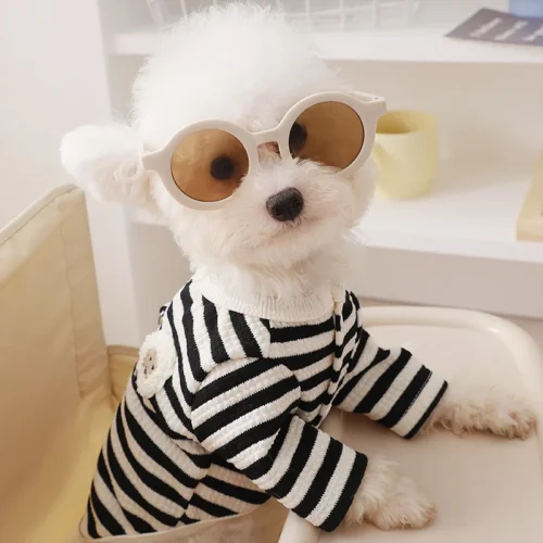 This is our custom dog striped outfit style, designed with classic black-and-white stripes for a simple but fashionable look that works well for everyday pet wear. We can customize the stripe pattern, fabric, sleeve length, patch details, sizes, and private label, so this style can be developed to match different brand collections and market preferences.