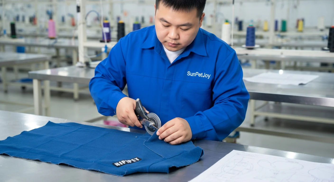 This is our precision cutting process where automated systems create exact dimensions for our dog snood for anxiety, upholding strict quality control and sizing consistency for dependable wholesale reliability.