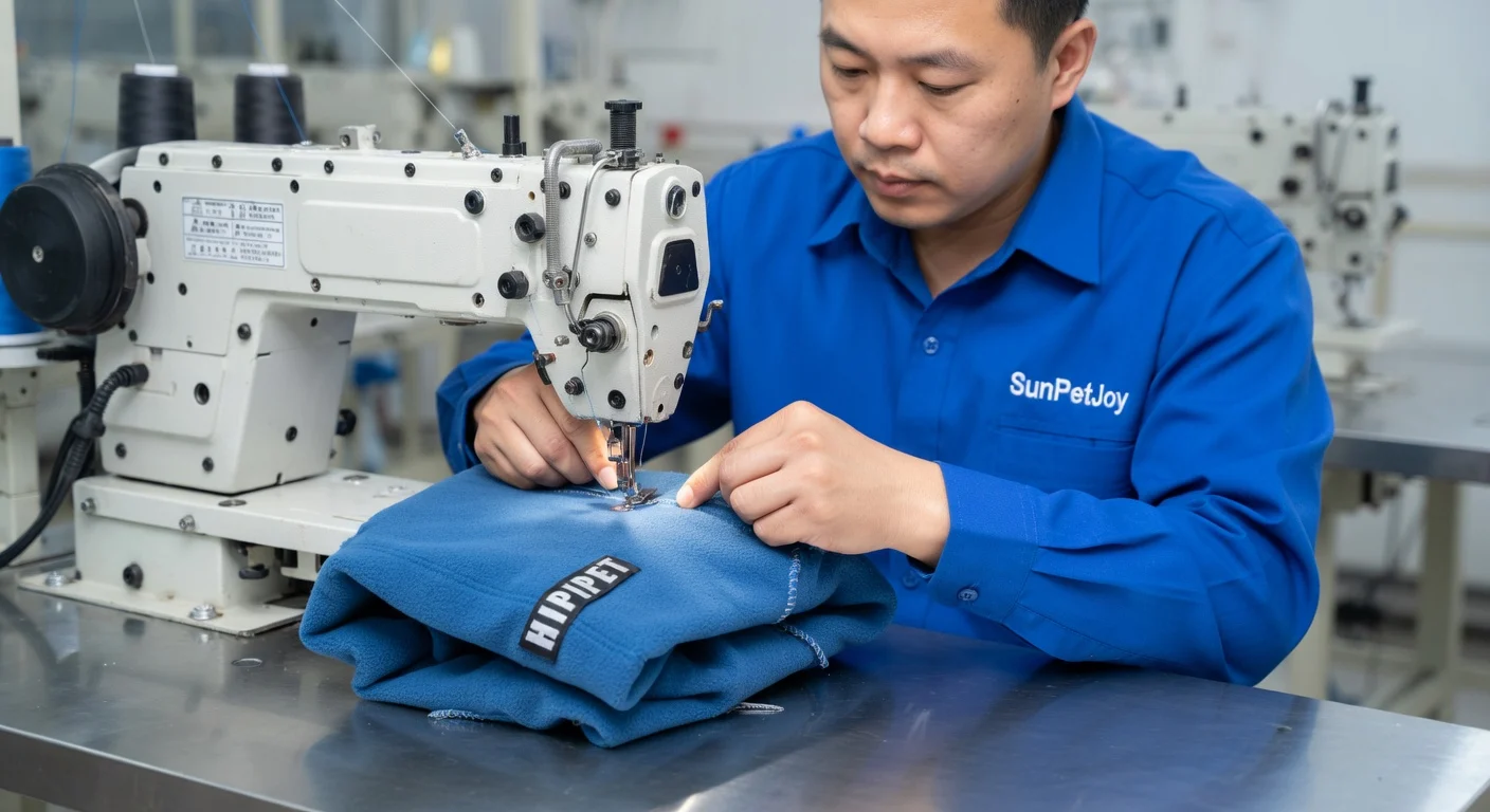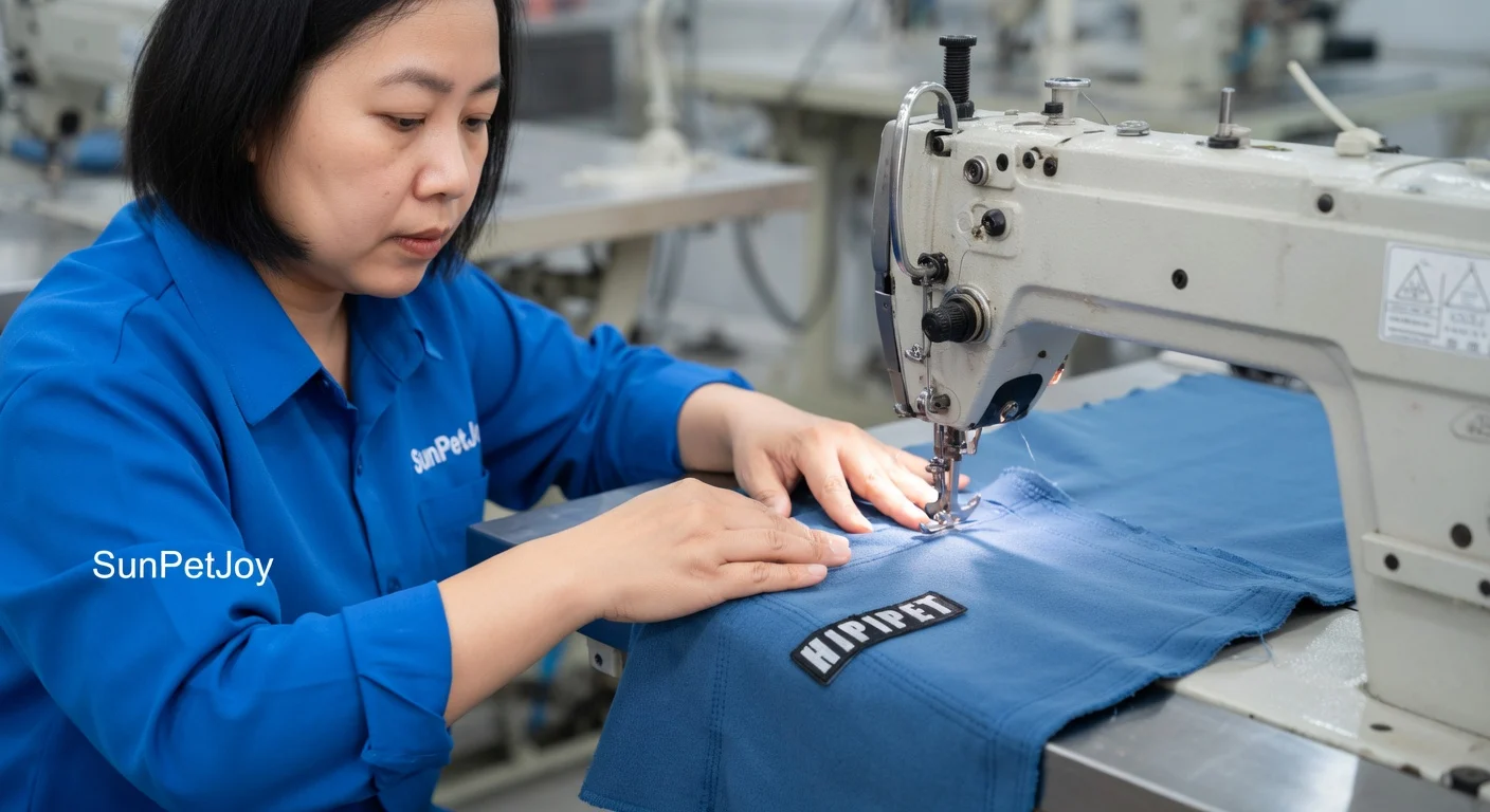 This is our reinforcement stitching operation where high-stress seams receive additional industrial passes on our dog snood for anxiety, enhancing durability and long-term consistency for bulk wholesale supply.