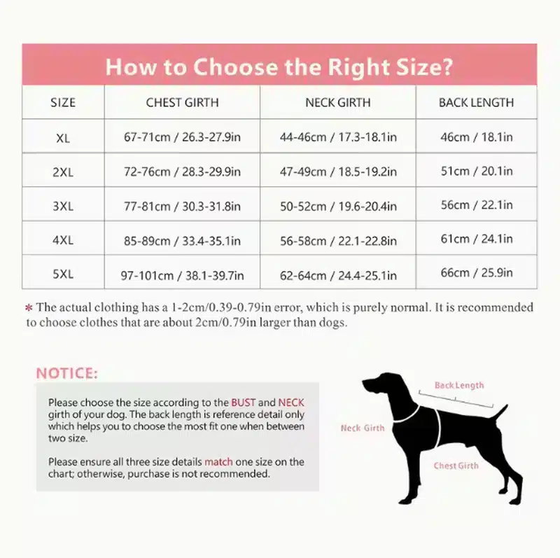 If your dog is between two sizes, choose the larger size. A 1–2cm (0.39–0.79in) deviation is normal—helpful guidance for buyers searching how to size a dog sun shirt.