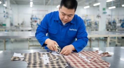 This is our precision fabric cutting process where we accurately mark and cut cotton plaid patterns for dog tee shirts, ensuring exact specifications and consistent quality for wholesale reliability.