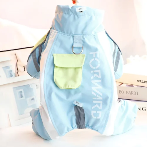 This is our stylish light blue UV protection dog jacket. It features a comfortable hood, reflective strips for added safety during outdoor activities, a convenient lime green pocket, and bold “FORWARD” lettering on the side, with full leg coverage for complete protection. We can customize this style with different colors, texts, or your own designs to perfectly match your needs.