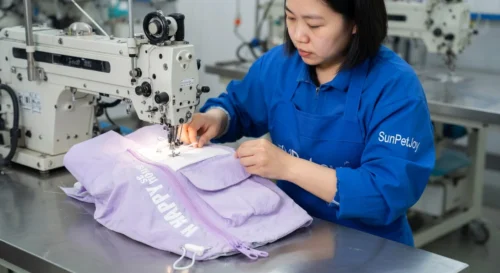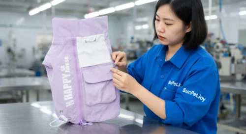 This is our skilled assembly step attaching the front storage pocket and securing the drawstring opening on the Dog UV Protection Shirt, guaranteeing component strength, dimensional consistency, and reliable performance for bulk orders.