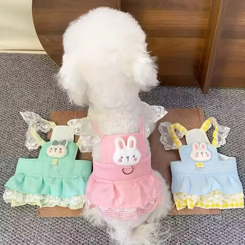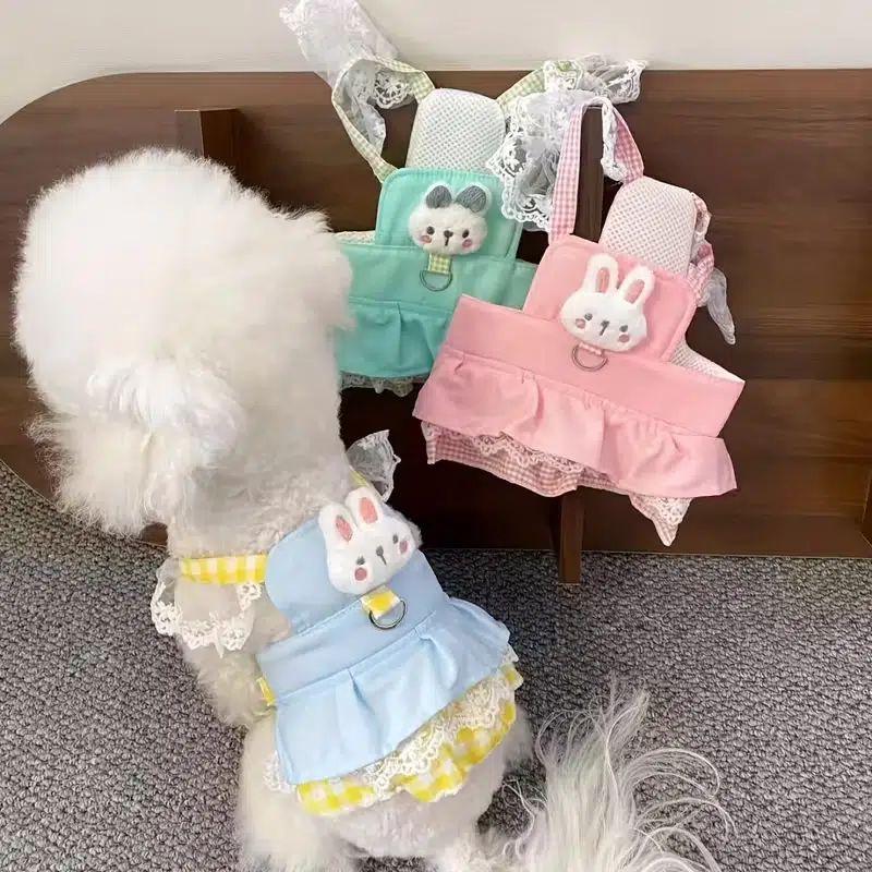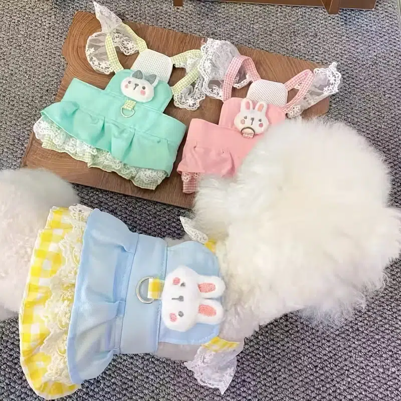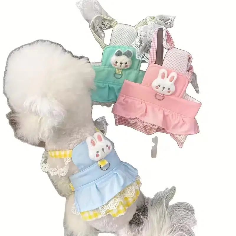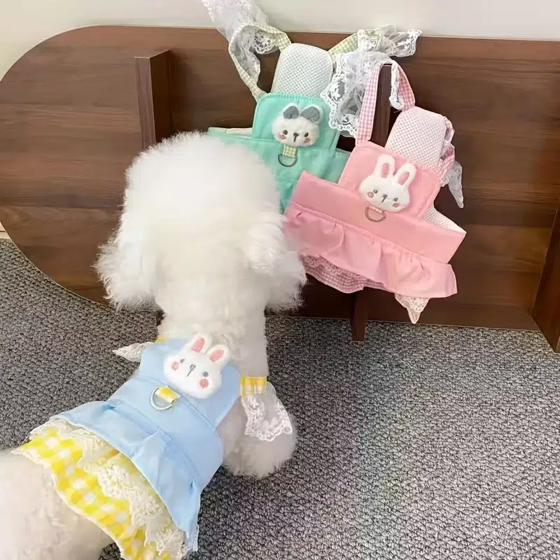 This is our sweet bunny-style dog dress harness, featuring a soft blue ruffle body, yellow gingham trim, breathable mesh panel, lace bunny ears, and an adorable plush chick detail on the chest; it’s a cute boutique-style design for small pets, and we can customize the colors, fabric combinations, decorations, and overall style to match your brand or seasonal collection.